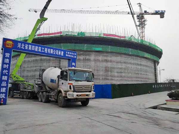 熟料储存及输送筒仓直径60米,高20.5米。1月11日,业主项目负责人王利杰组织召开专题会议,郑重要求1月20日前滑模施工必须完成。面对业主早日投产的殷切期盼,项目部紧急组织施工策划,明确抢进度措施办法,全体动员,多点发力,全力以赴保滑模施工。在动员会上,成立了以项目经理为组长的滑模领导小组,班子带班,明确责任目标;与作业班组签订安全、质量承诺书,增强其责任意识;购置钢筋间距测量设备,节省验收钢筋工程时间和人力。由于疫情原因,现场劳力不能迅速到位,项目部提前组织管理人员晚上加班吊运钢筋、水泥、脚手板等材料,大家高涨的干劲儿在滑模现场起到了积极的带动作用。库壁预应力钢绞线设置较为密集,每间隔26厘米一道,而且带有柔性,往库壁钢筋内穿设时容易跑偏,工作效率低。为加快施工,技术人员巧妙地在库壁钢筋上加设了U型钢筋固定钢绞线穿行位置,然后大家一字排开,“一二、一二……”齐声喊着口号,有节奏地用力将钢绞线在库壁钢筋里穿行直到扶壁柱。数九隆冬的夜间滑模平台上气温很低,但是大家的工作热情不减,干劲不退,抬钢筋、绑钢筋、穿钢绞线……,干得热火朝天,没有人叫苦喊累,在大家的共同努力下,滑模以每天2.7米的速度快速推进。